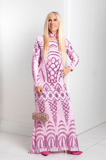 Long Sleeve / Jewel Neck Gown to the floor Pink All Over Sequined Pattern Silk...