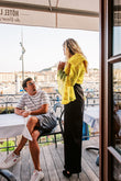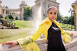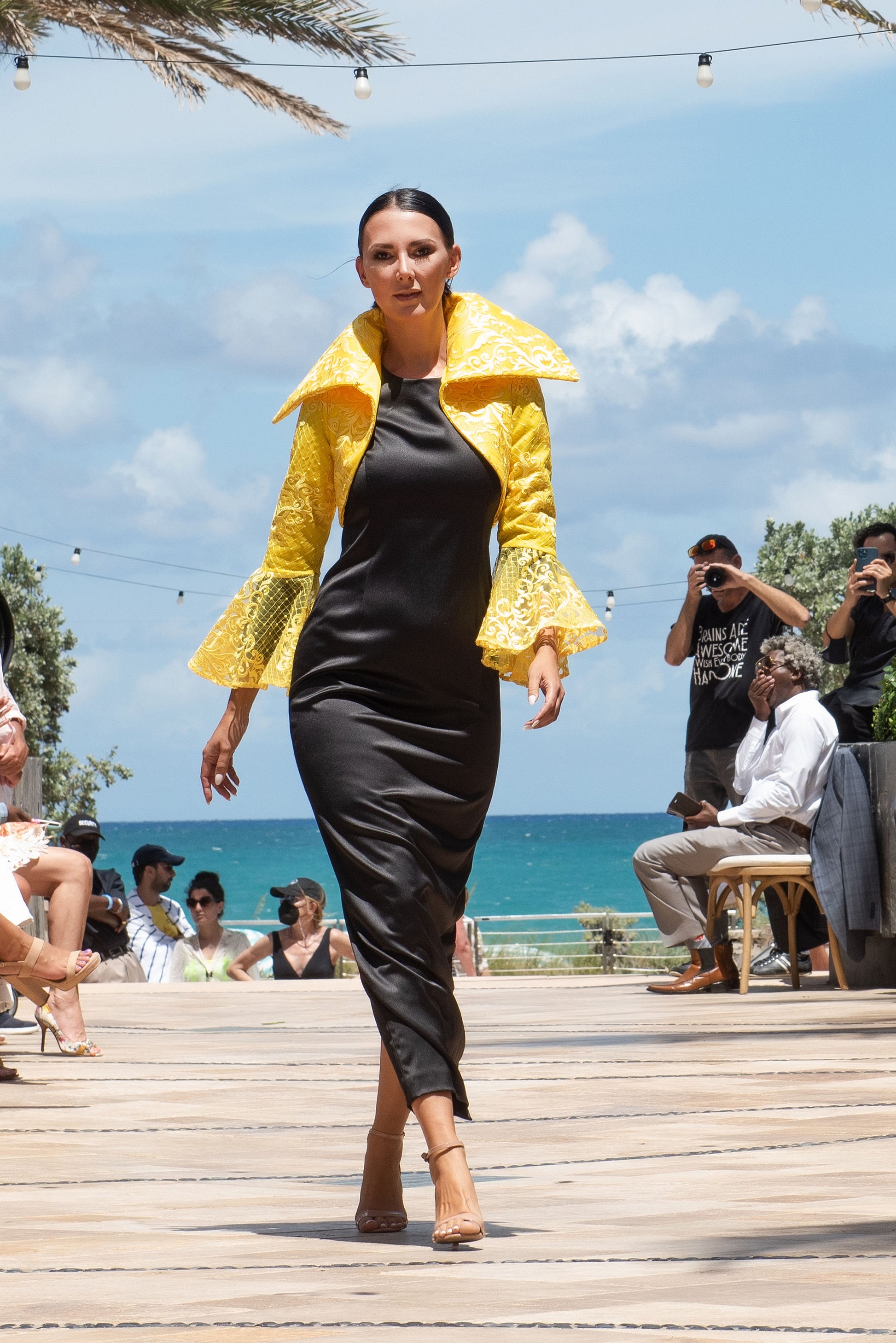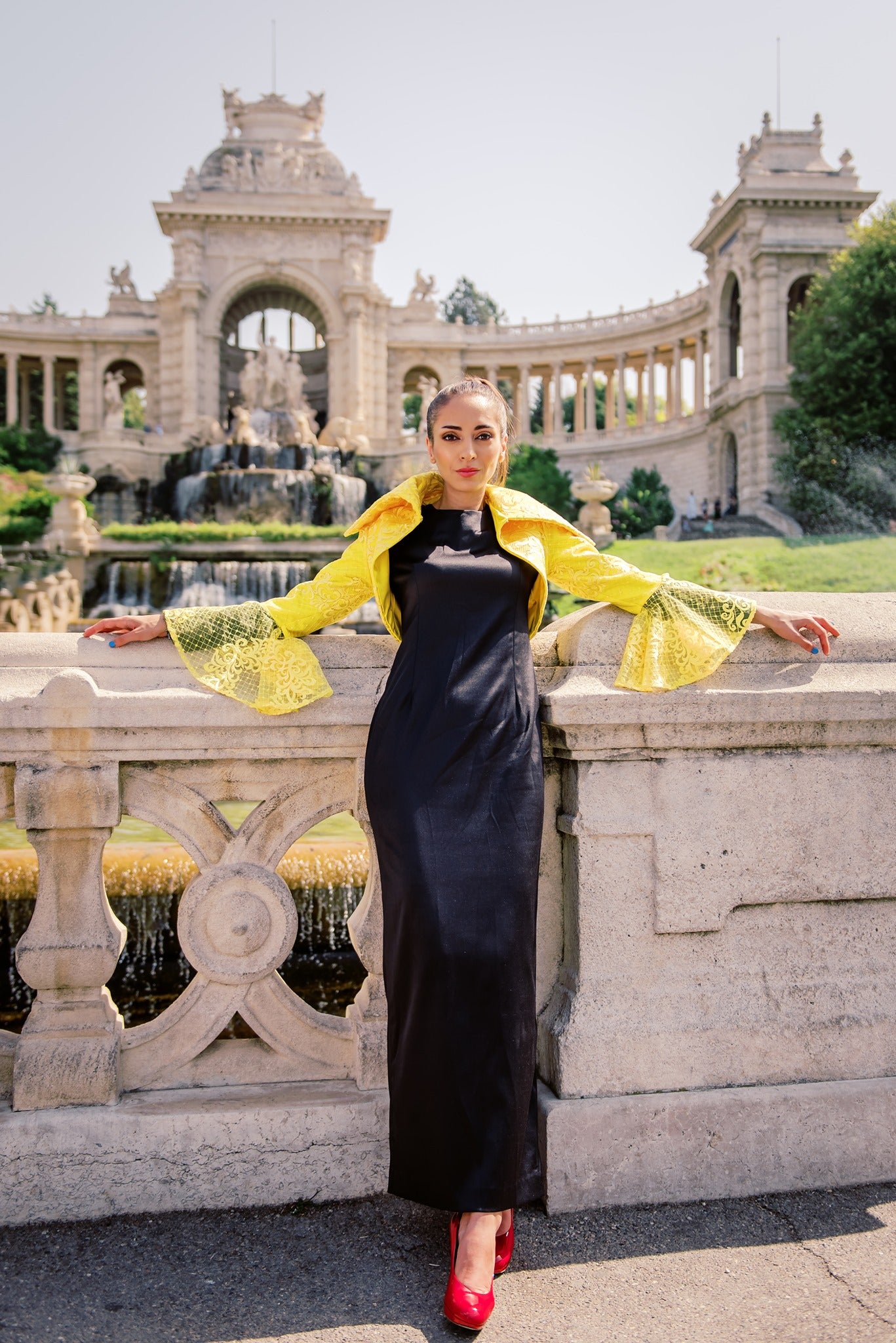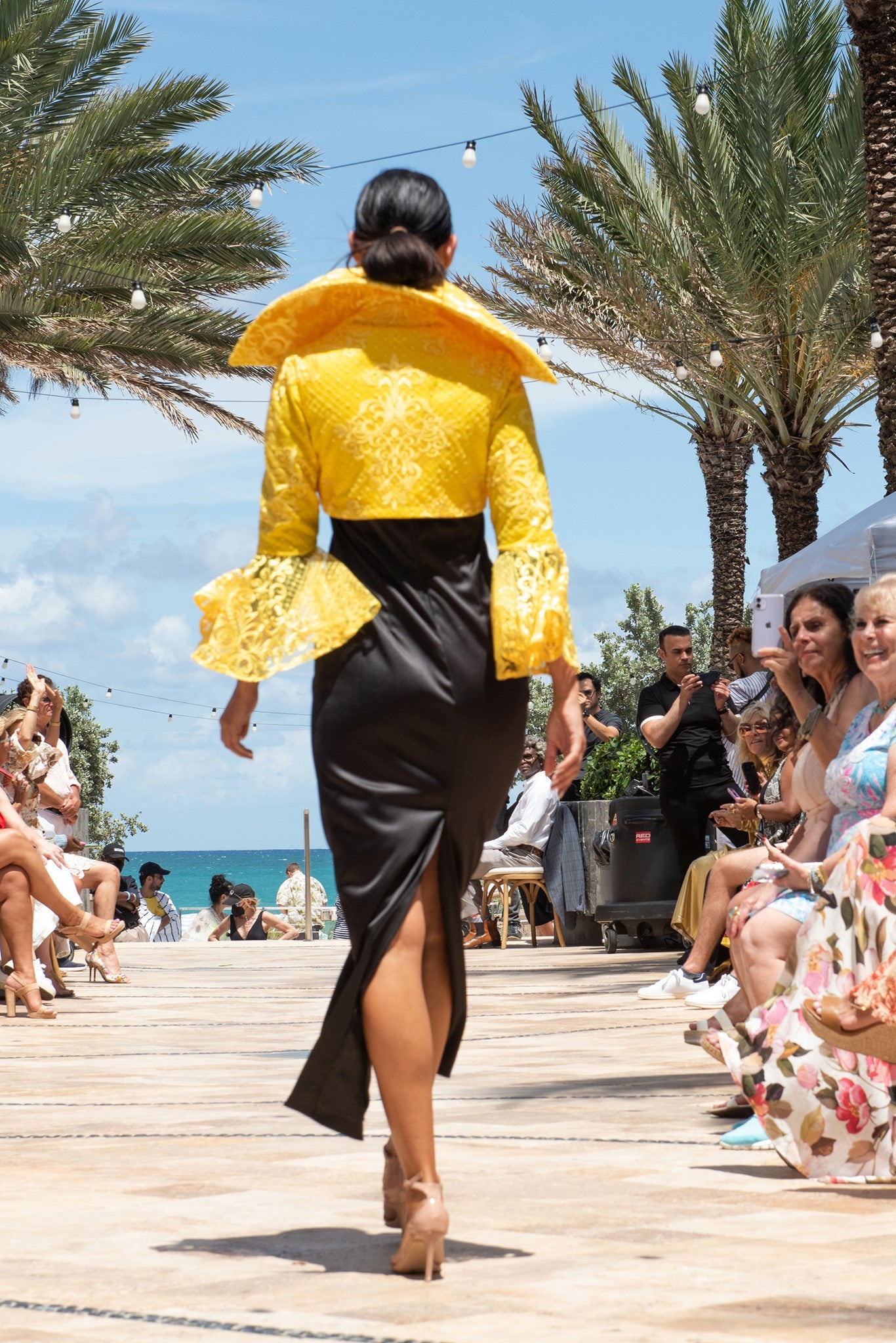Bee mine in this stunning design. Perfect for date night or an evening on the town. The two-piece outfit features a yellow brocade silk bolero jacket with high open collar and wide-open shear sleeves. A stunning black sleeveless gown in silk is worn underneath.