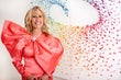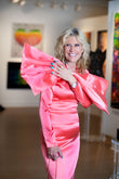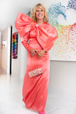 Jewel neck long sleeve, silk Pink gown to the floor. Polyester lining under the body of the gown. Color: Pink with a large pink bow extended over the bodice. The bow has a clear rhinestone clasp in the center of the bow.