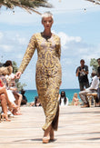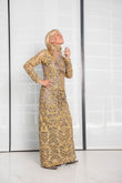 A meticulous melody of gold, glitter and glamour. Featuring a jewel neck, long sleeves, and silk brocade gown that is worn to the floor. Shear material and polyester lining under the body of the gown add dimension to this soft yellow and grey evening wear.