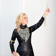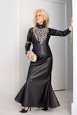 Say goodbye to your little black dress and hello to a black leather gown. The mermaid flair-bottom also features black tulle on either side of dress bottom. Mock turtleneck long sleeves complete the look.