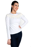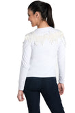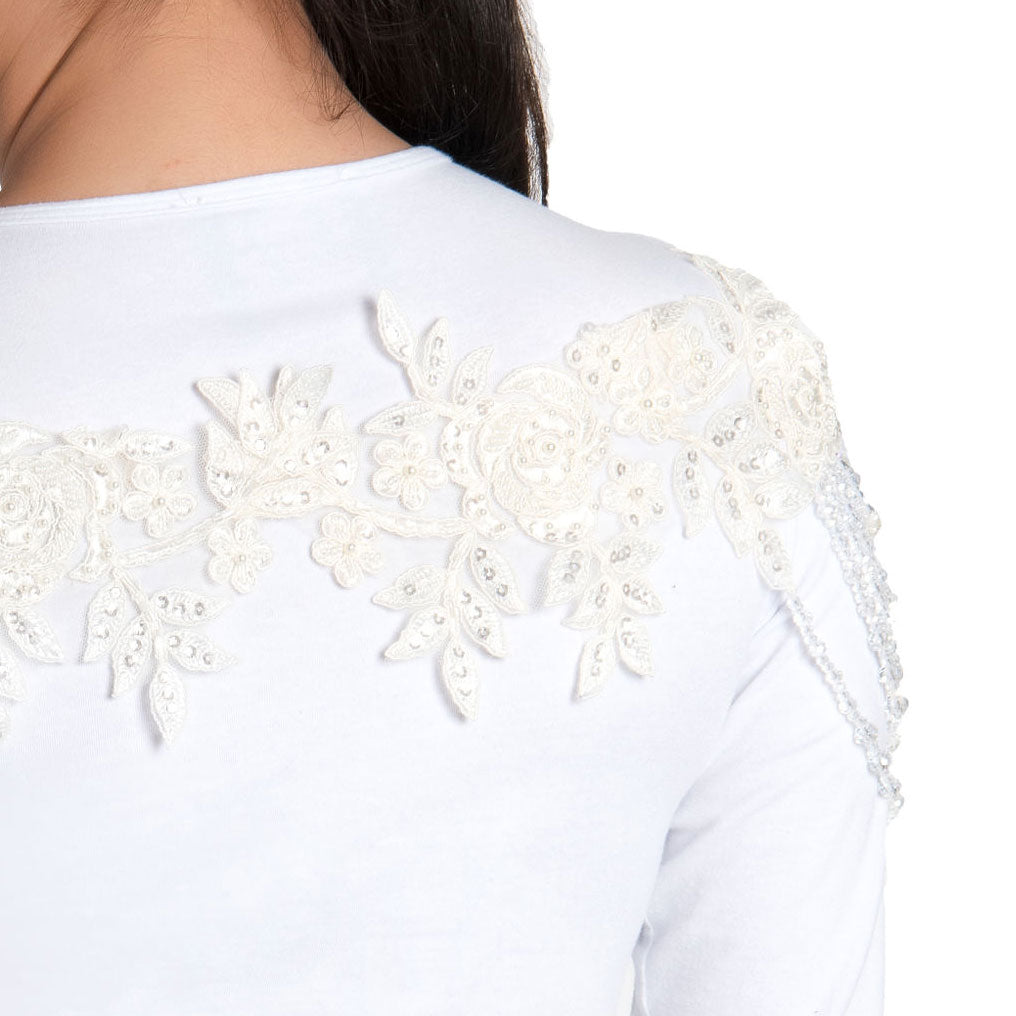 Long Sleeve White Top With Jeweled Neckline With White Lace Applique Expanding Over Shoulders - Front and Back. Made to Order.