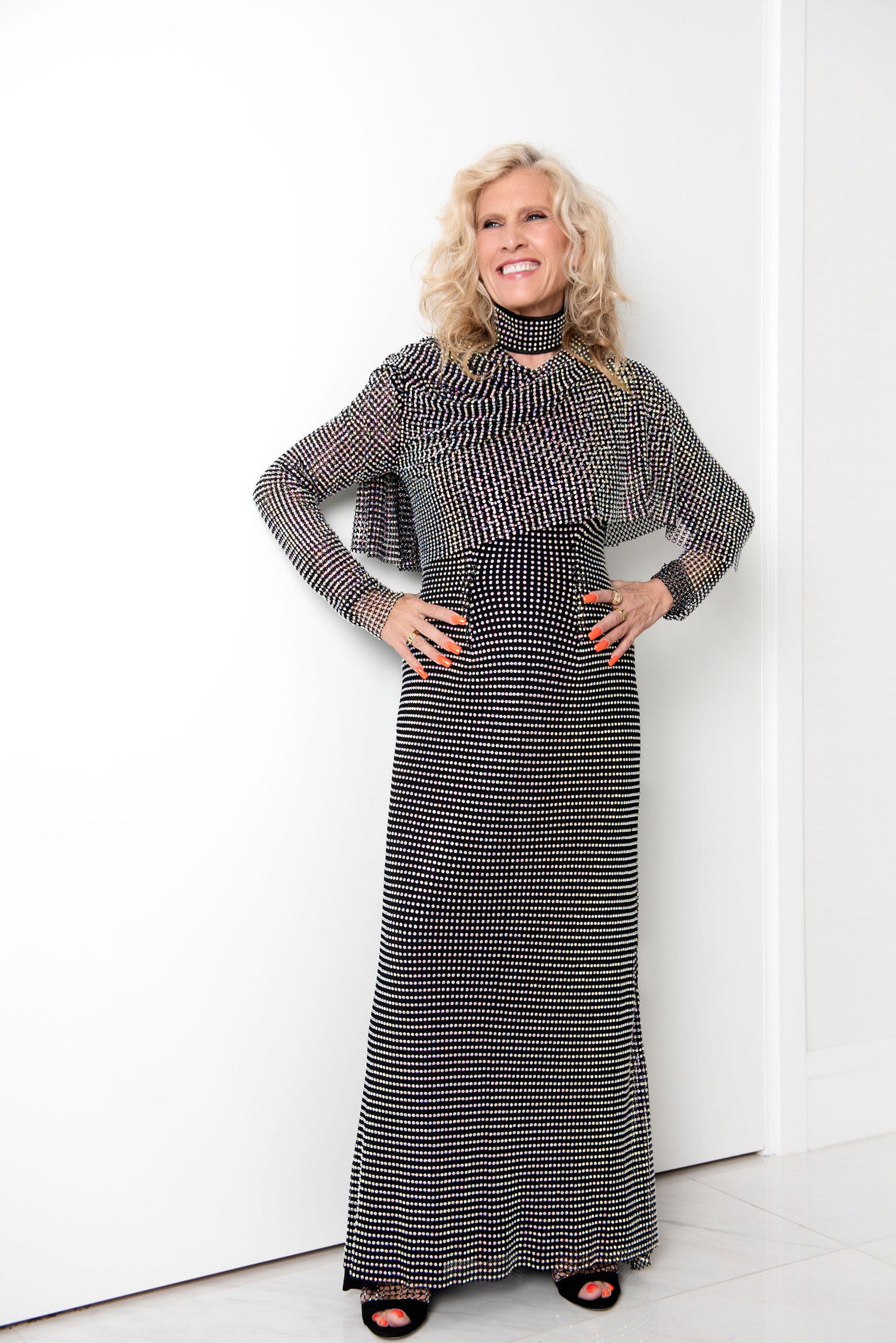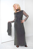 Donna Leah Designs is excited to present this beaded crystal black gown with matching shawl. The unique fabric is a signature of Donna Leah and captures the light adding to the drama. This exquisite long sleeve gown is perfect for a night of dancing and celebrating at any special event. The gown features a sophisticated jewel neckline and gown length that is worn to the floor, which makes it perfect year-round wear.