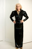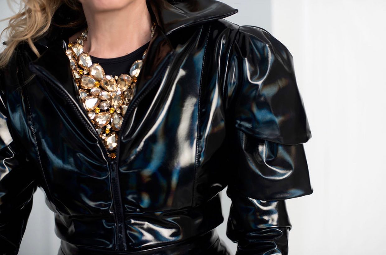 Classy and edgy, double puff sleeves and a zipper front cropped jacket in black stretch spandex. This two-piece comes with a matching black maxi skirt.