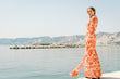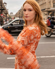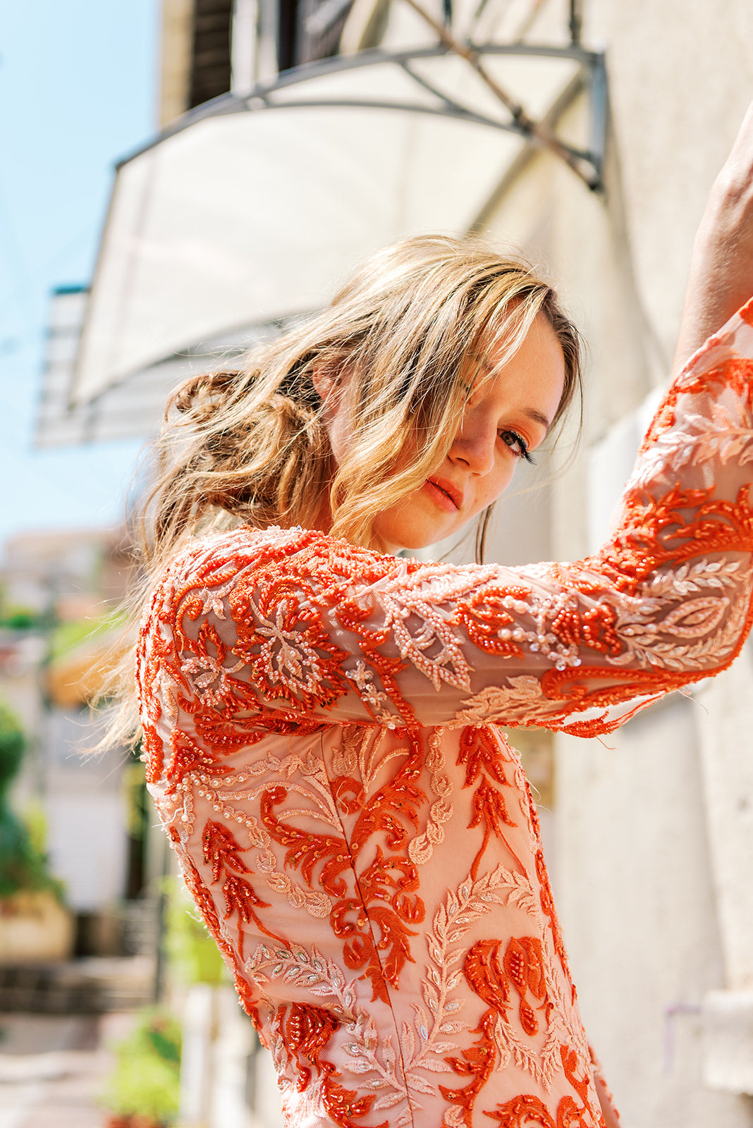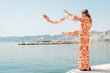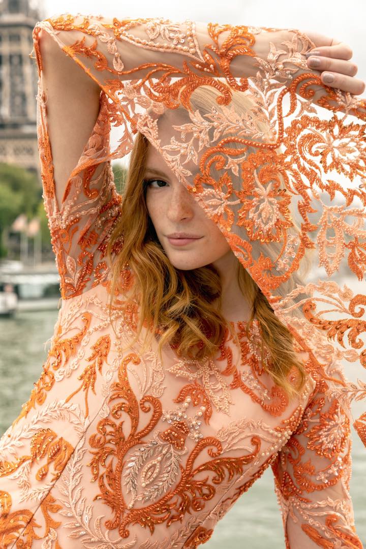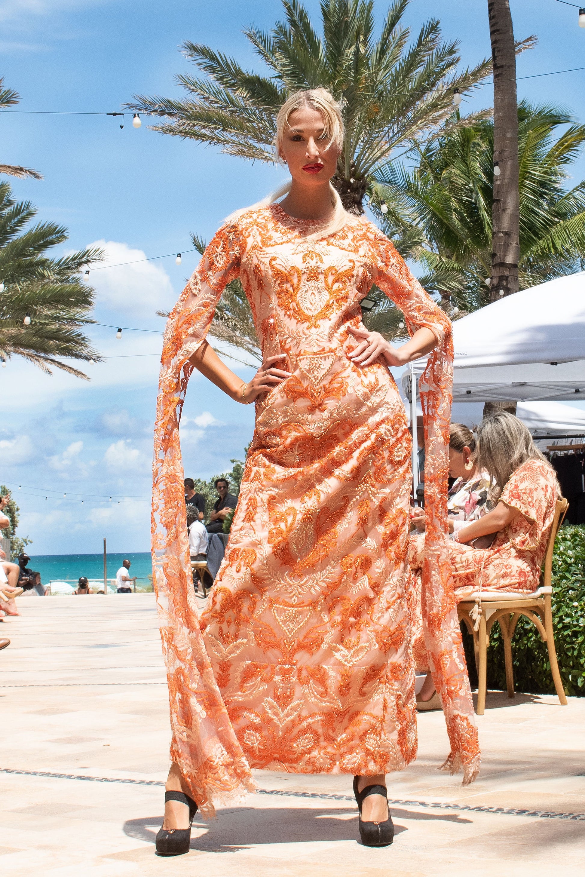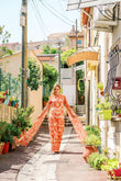 When drama is your favorite accessory this jewel neck, silk brocade floor length gown is the answer. Polyester lining under the body of the gown highlights the various shades of pink, rust, and orange on a lattice design floral motif.