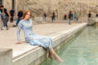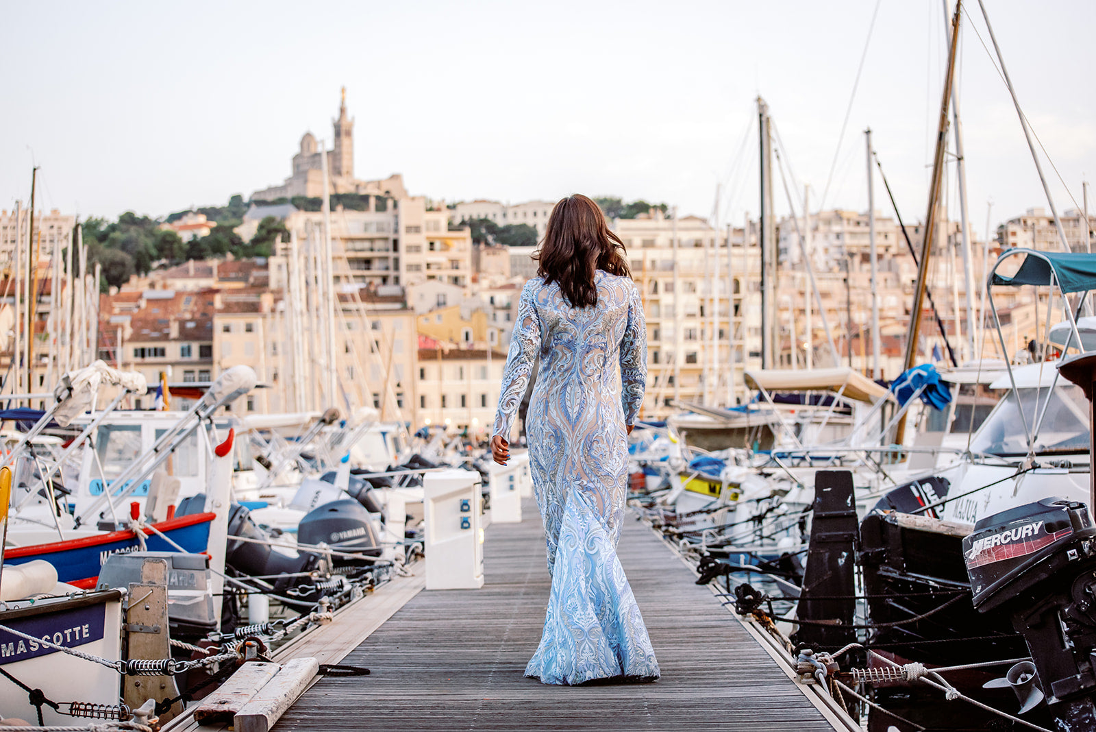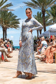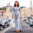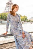 A dance of details and delicate drama come together with this jewel neck long sleeve gown in various shades of blue lattice floral motif. Created in stunning silk brocade that is worn floor length. Polyester lining under the body of the gown for added dimension.